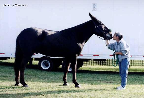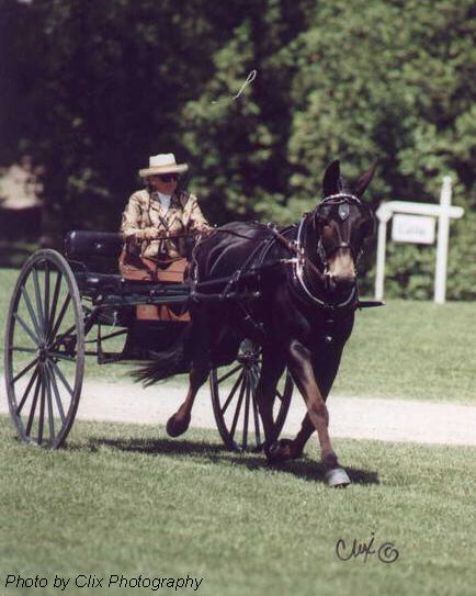 Well I started out with this vague idea that I would replace my wonderful 10 year old Belgian/Saddlebred cross mare (who developed a breathing disorder) with a mule. Many years ago I had been a participant at a driving and riding demonstration where a local woman had brought two Belgian cross mules. I was fascinated with the mules and spent a long time talking to her about them and observing them. The possibility of owning a mule was always in the back of my mind. Well, on January 1, 1996 I decided that I needed to get serious about finding a new replacement equine and I would start looking into a mule. I gathered all the Brayers [published by the American Donkey and Mule Society] I could find and any other mule magazines. I stopped at farms where I saw mules [one near where I live in upstate NY]. I called the woman from all those years ago at the demonstration. I called Reese Brothers Mule Co, MaryLou Bridgeman, here in NY, Lloyd Hawley and Meridith Hodges, and Barbara Hunter/Cindy Powell of Hunter Mt Farm, among many, and picked their brains and asked if they knew of any mules for sale that would fit my needs. I subscribed to the Brayer,